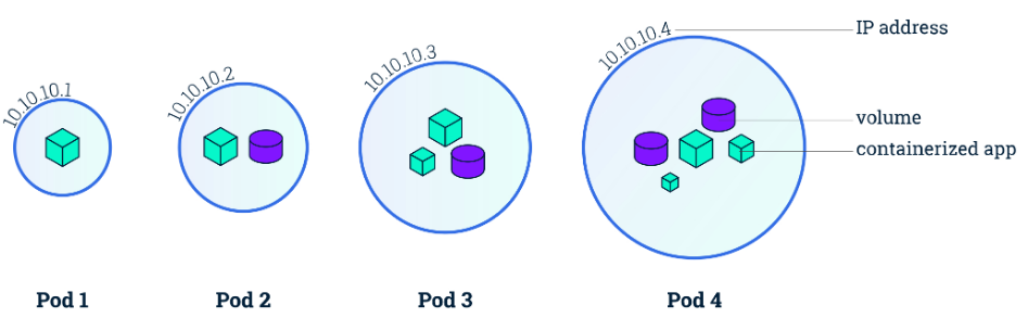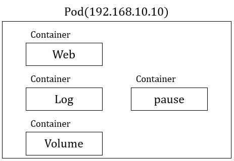 아래 이미지와 같이 하나의 포드가 있을 때, 포드 내 컨테이너는 웹 서버, 로그 수집기, 볼륨 컨테이너라는 각각의 역할을 가질 수 있습니다. 포드 내 컨테이너는 포드 IP(192.168.10.10)를 공유합니다. 외부에서 포드에 접근할 때는 포드 IP(192.168.10.10)로 접근합니다. 컨테이너에 접근할 때는 컨테이너마다 설정된 포트로 접근합니다.