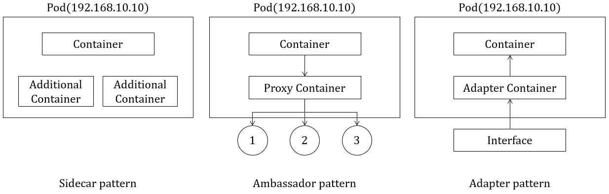- 어댑터 패턴: 포드 외부로 노출되는 정보를 표준화하는 어댑터 컨테이너를 사용하는 패턴