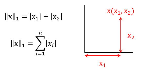 L1 Norm은 벡터의 절대값을 모두 더한 값으로, 맨해튼 거리(Manhattan Distance)라고 합니다.